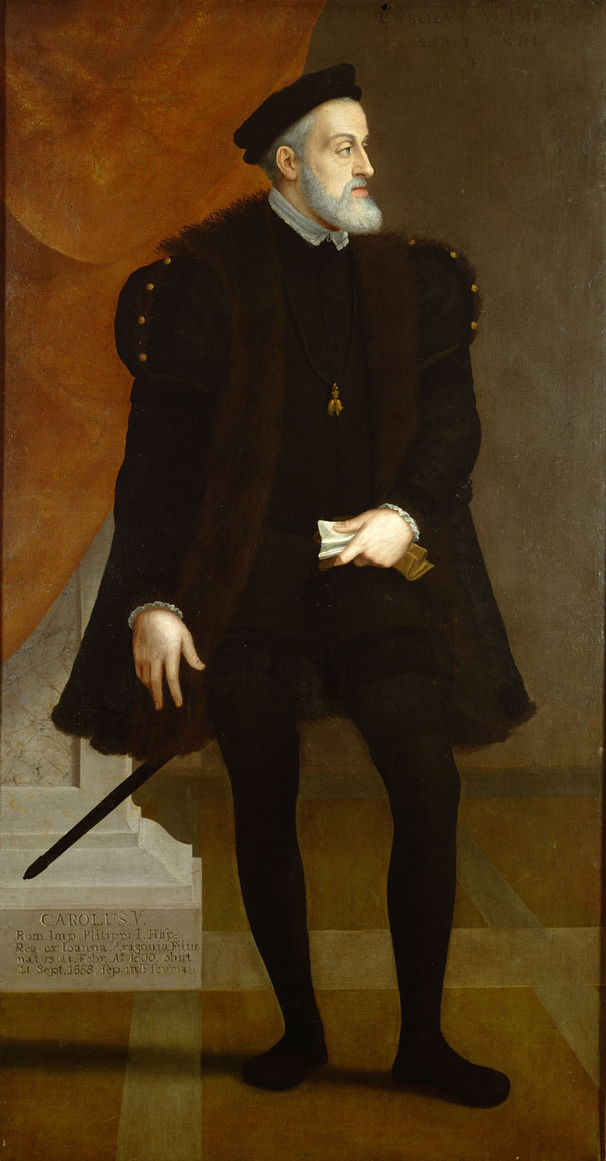 Rechts oben: CAROLVS IMP.AN.AET.A.L.MDL; links unten am Pfeilersockel später hinzugefügte Inschrift: CAROLVS V. Rom. Imp. Philippi I. Hisp: Reg. ex Joanna Aragonia Filius natus 24. Febr. A.o 1500. obiit 21. Sept. 1558. sep. in Escuriali